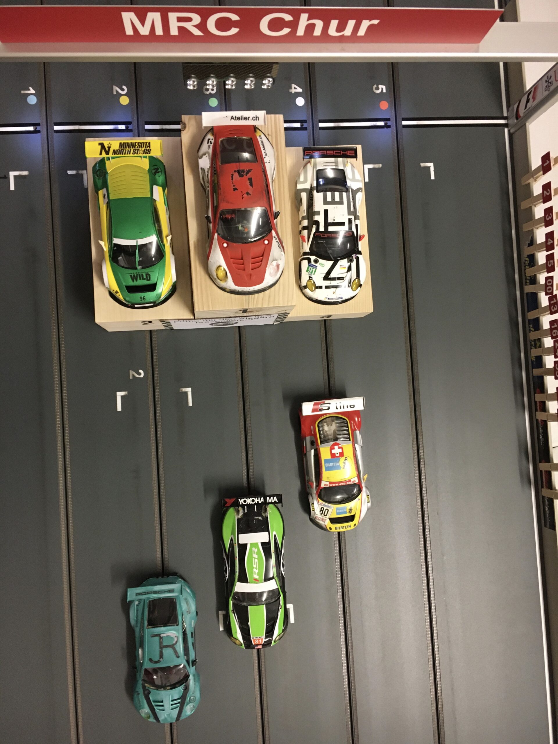 Schulter an Schulter standen die zwei Kontrahenten nebeneinander an der Holzbahn. Das Championsduell startete für Pascal einmal mehr auf Spur 1. Gleich daneben, nichts Neues in dieser Saison, Fabrizio auf der Spur 2. Der Slotcar-Modus wollte es so, dass sie sich durch den Wechselrhythmus im letzten und achten Durchgang auf den schnellen Spuren 2 und 4 definitiv um den grössten «Wildstein» aus dem berühmt berüchtigten Scaläratobel, sprich den Meisterpokal, massen. Fabrizio, vom Fleck weg, fuhr mit irrem Speed und top Konstanz um die Kurven und verschaffte sich kontinuierlich einen grösseren Vorsprung im Meisterrennen. Pascal, Eberhard und bis zuletzt Marco versuchten Fabrizio den Weg bis zum Slotracing-Karrierehöhepunkt möglichst schwierig zu gestalten. Aber: Zu abgeklärt und ohne Fehler, zu stark in den wichtigen Details und über die gesamte Saison betrachtet, zog Fabrizio seine Triumphfahrt durch und gewann absolut verdient das letzte Scalära Cup Rennen und so auch die Meisterschaft. Pascal schwächelte nur wenig aber entscheidend im Rennen, konnte sich aber dennoch den zweiten Meisterschaftsplatz vor dem heranbrausenden Marco sichern. Eberhard, Livio und Tamara komplettierten die Top 6 auf den nachfolgenden Plätzen in der Endrangliste.